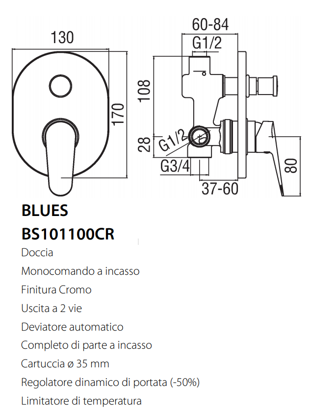 • Tipologia: miscelatore doccia a 2 uscite con deviatore con regolatore dinamico di portata