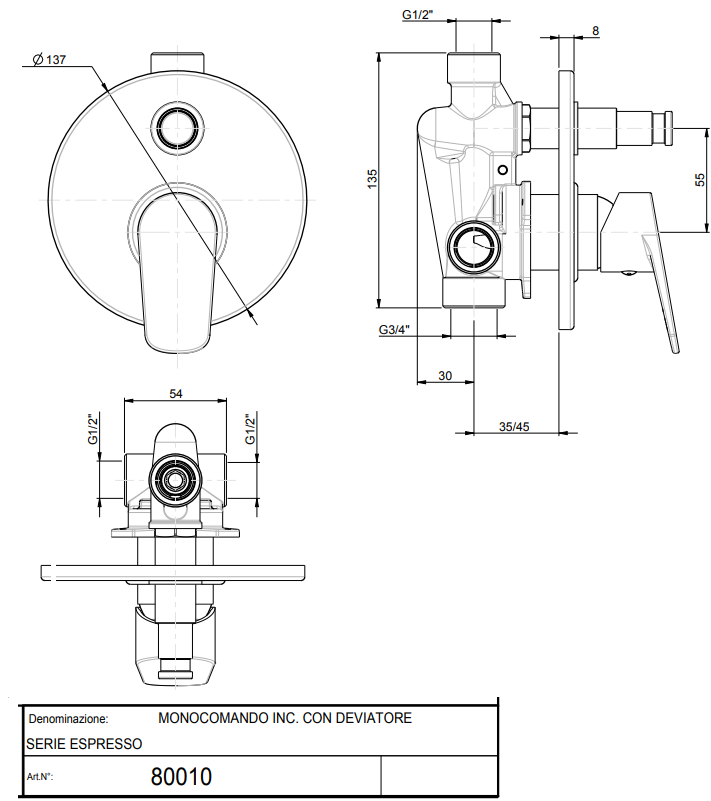 Miscelatore incasso doccia Fratelli Frattini modello Espresso art. 80010 fornito di piastra e deviatore automatico ed attacchi da ½" per un uso immediato ed agevole; realizzato in ottone Cromato, in grado di resistere al meglio ad umidità ed agenti esterni. Attacchi standard da ½" per garantire massima compatibilità con tutte le tipologie di impianti.