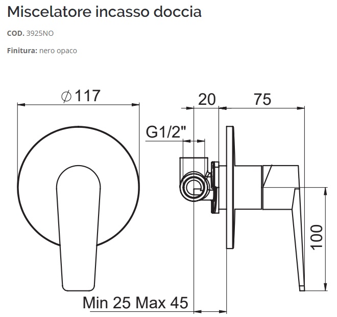 Miscelatore incasso doccia Artis modello Cristallo in finitura nero opaco fornito di piastra e corpo incasso ad attacchi da ½" per un uso immediato ed agevole; realizzato in ottone, in grado di resistere al meglio ad umidità ed agenti esterni.