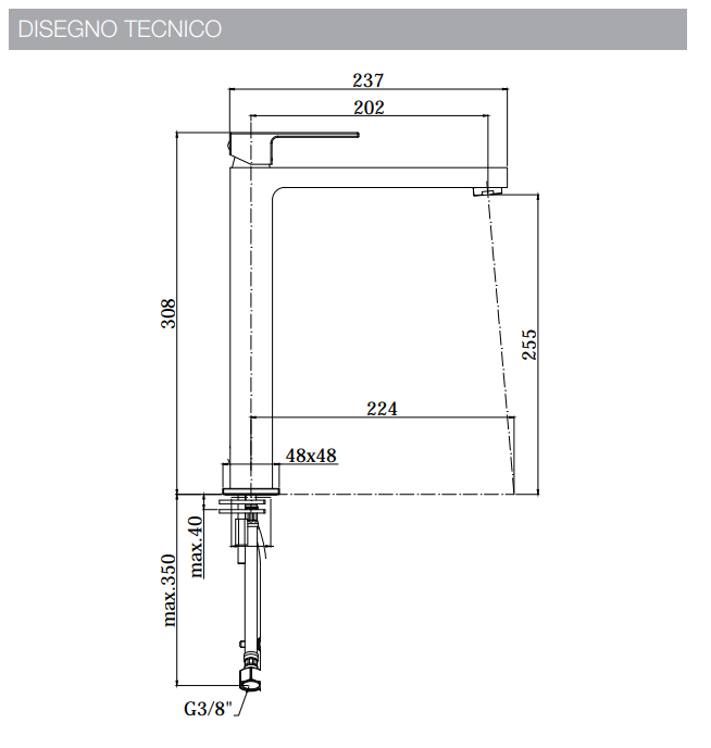Il miscelatore non è dotato di salterello e di piletta di scarico, risultando dunque ideale da abbinare a tutti i lavabi realizzati in materiali moderni quali il vetro temperato ed il cristallo ed alla apposita piletta click clack.