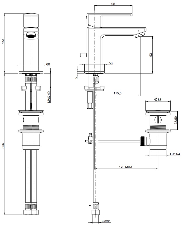Il miscelatore lavabo è in ottone cromato con finiture lucide ed eleganti, a scarico automatico 1"1/4 (universale) completo di salterello, piletta e flessibile.