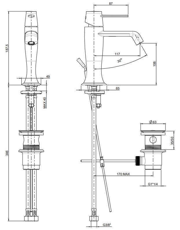 Il miscelatore lavabo è in ottone cromato con finiture lucide ed eleganti, a scarico automatico 1"1/4 (universale) completo di salterello, piletta e flessibile.