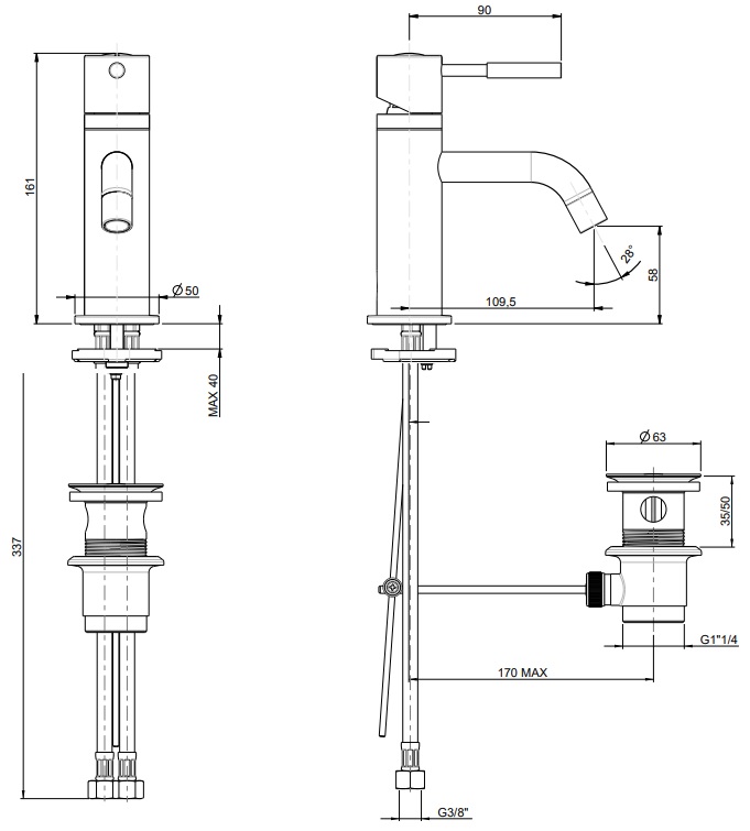 Il miscelatore lavabo è in ottone cromato con finiture lucide ed eleganti, a scarico automatico 1"1/4 (universale) completo di salterello, piletta e flessibile.