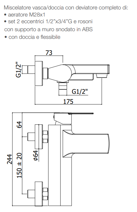 Questo nuovo miscelatore vasca di Paffoni modello Tango art TA023 CR è fornito di deviatore, areatore M28x1, doccia con flessibile e supporto a muro SNODATO.