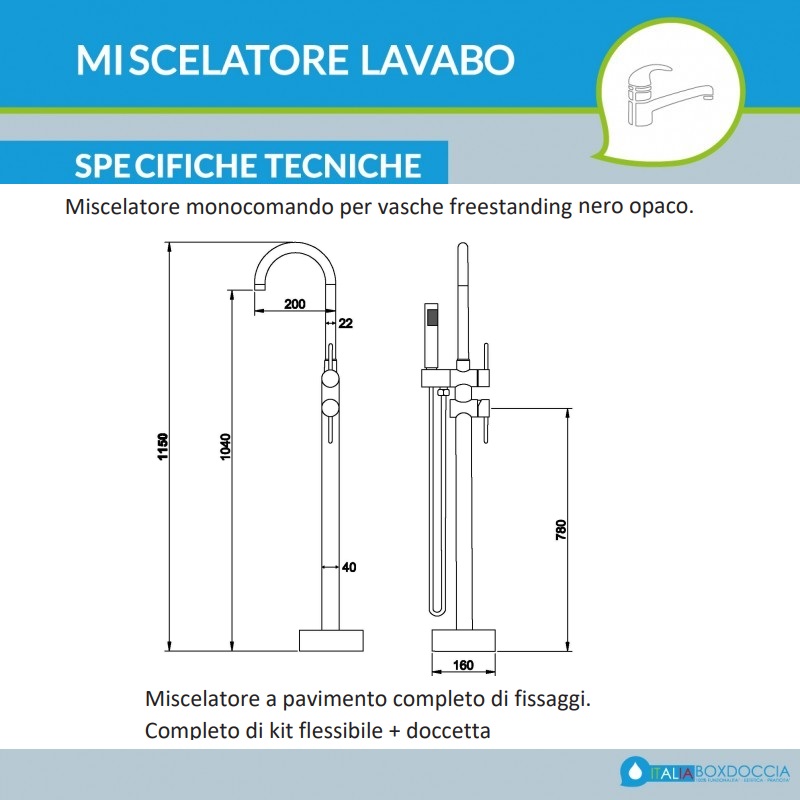 Le vasche a centro stanza sono una soluzione sempre più diffusa per arredare un bagno elegante e di design. Questo particolare tipo di vasca da bagno freestanding necessita di adeguati miscelatori con colonna a pavimento. Questo rubinetto per vasca da bagno freestanding è realizzato in ottone finitura nero opaco. Un miscelatore moderno che si adatta ad ogni tipologia d'arredo bagno, prodotto con materiali si alta qualità per soddisfare anche i clienti più esigenti.