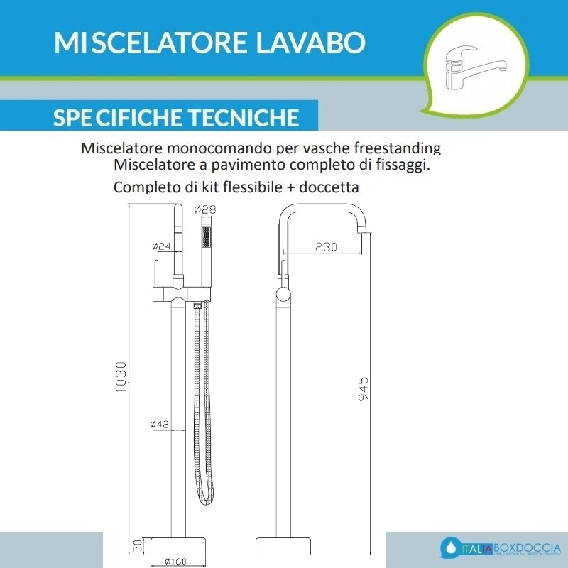 Le vasche a centro stanza sono una soluzione sempre più diffusa per arredare un bagno elegante e di design. Questo particolare tipo di vasca da bagno freestanding necessita di adeguati miscelatori con colonna a pavimento. Questo rubinetto per vasca da bagno freestanding è realizzato in ottone finitura cromo lucido. Un miscelatore moderno che si adatta ad ogni tipologia d'arredo bagno, prodotto con materiali si alta qualità per soddisfare anche i clienti più esigenti.