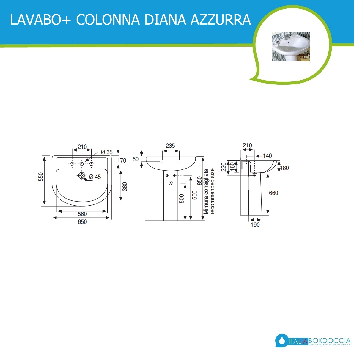 Della collezione Diana di Ceramica Azzurra fa parte questo speciale lavabo di dimensioni cm 65x54x18h in ceramica bianca lucida. Completo di colonna per installazione a terra, questo lavabo in ceramica è dotato di monoforo per la rubinetteria e di foro troppo pieno.
