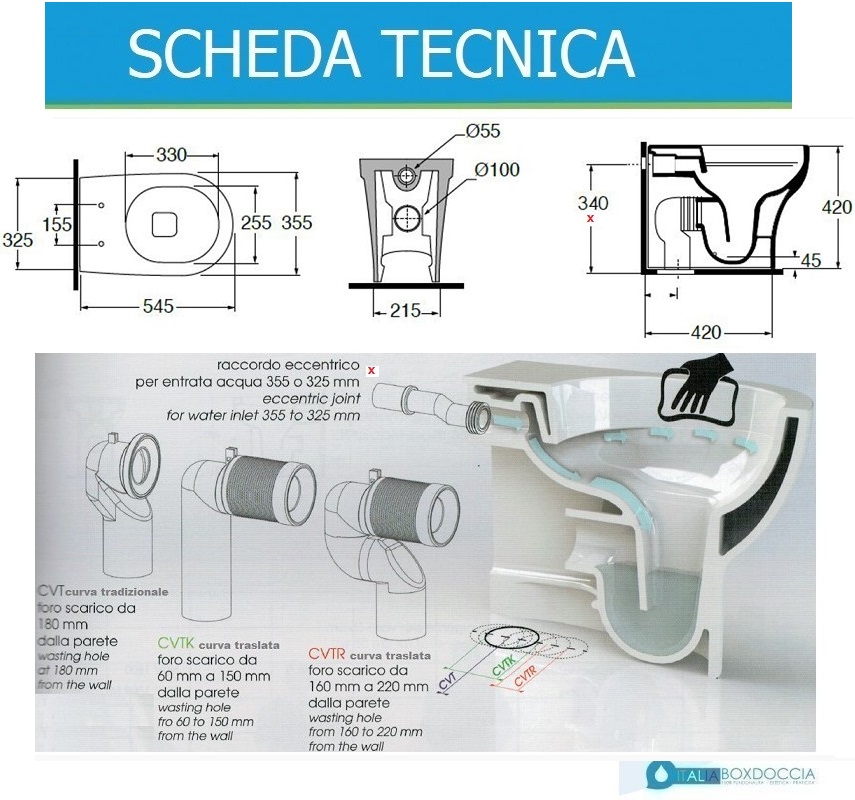 - curva tecnica per foro scarico distante da 160 a 220 mm dalla parete