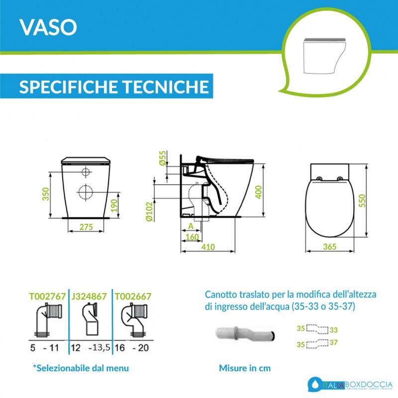 – n°1 Vaso Filo muro scarico traslato Ideal Standard modello Connect. Sanitario certificato per scarico 3/4,5 litri art. E052501 Bianco Lucido EU
