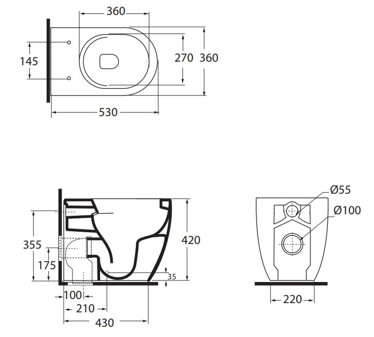 1 vaso a terra filomuro senza brida comoda con scarico a parete trasformabile a pavimento tramite curva tecnica (cod. COM 100 E);
