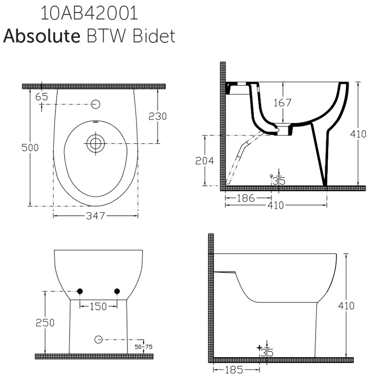 1 vaso a terra filomuro senza brida absolute con scarico a parete trasformabile a pavimento tramite curva tecnica (cod. 10AB10001);