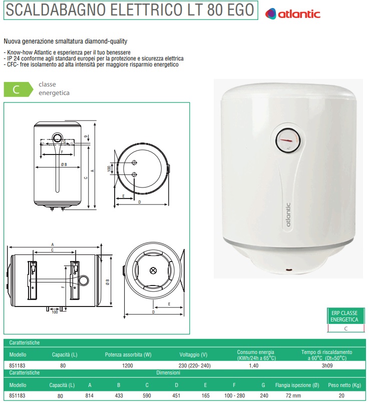 Lo scaldabagno EGO di Atlantic è uno scalda acqua di tipo tradizionale che unisce all’ottima tecnologia del suo Marchio, qualità e semplicità di installazione ed utilizzo.