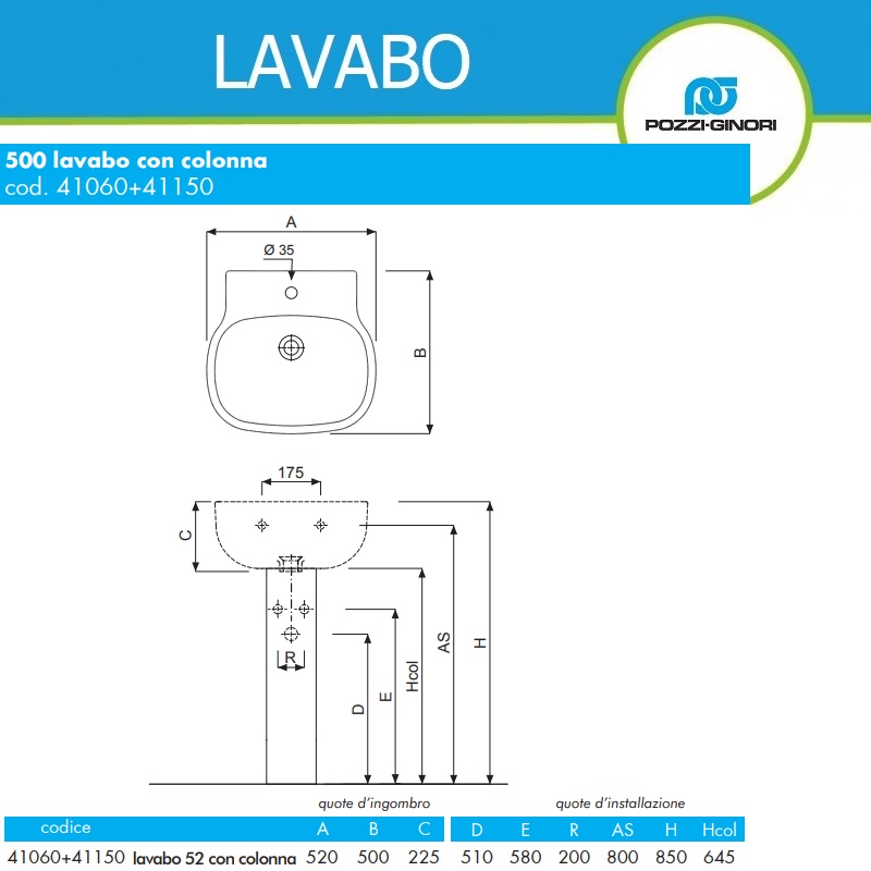 Lavandino Pozzi Ginori da 52 cm con piano rubinetteria su colonna. Le linee morbide e le forme ridotte fanno di questo lavabo un elemento d'arredo e di design per dare un tocco di originalità e personalità al bagno.