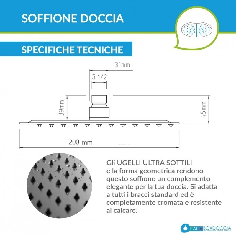 Soffione per doccia tondo, ultra slim in acciaio, con effetto a specchio, attacco universale da 1/2, è dotato di ugelli in particolare gomma anticalcare, che dopo ogni utilizzo se asciugati, e senza l'utilizzo di prodotti acidi, potranno durare all'infinito. La particolare fattura di questo soffione, lo rende ideale per chi è alla ricerca di un soffione doccia di design che sappia coniugare estetica e funzionalità senza pari in ambienti moderni e ricercati.