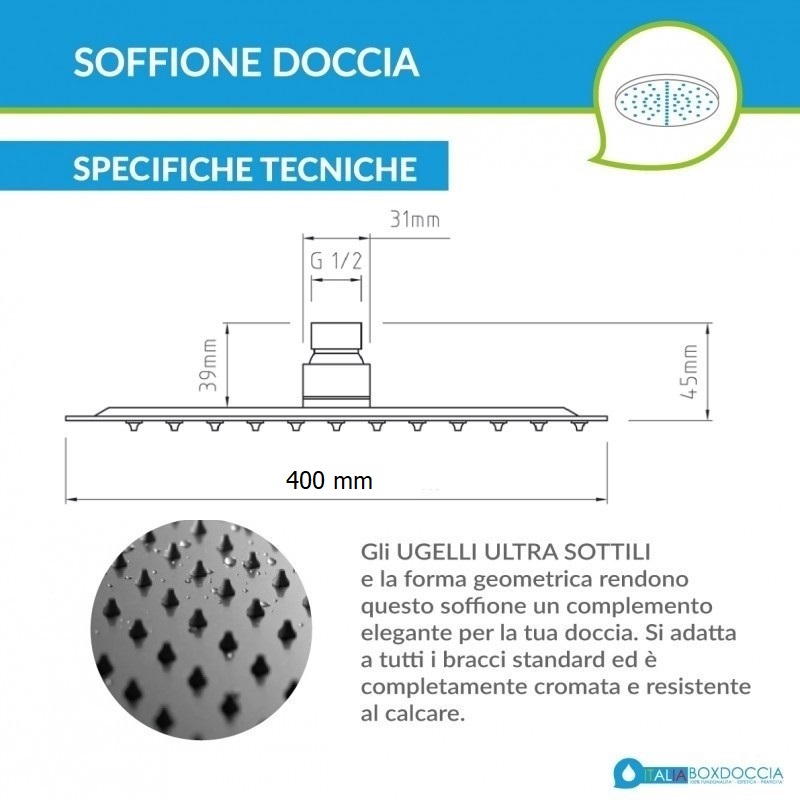 Soffione per doccia tondo, ultra slim in acciaio, con effetto a specchio, attacco universale da 1/2, è dotato di ugelli in particolare gomma anticalcare, che dopo ogni utilizzo se asciugati, e senza l'utilizzo di prodotti acidi, potranno durare all'infinito. La particolare fattura di questo soffione, lo rende ideale per chi è alla ricerca di un soffione doccia di design che sappia coniugare estetica e funzionalità senza pari in ambienti moderni e ricercati.