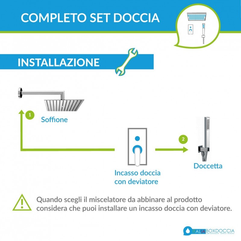 I set doccia proposti da ItaliaBoxDoccia si abbinano perfettamente con qualsiasi tipo di arredo bagno, miscelatori da incasso con deviatore e di vasche da bagno; grazie a questa versatilità, il montaggio e l'utilizzo di queste composizioni doccia sono molto facilitati.