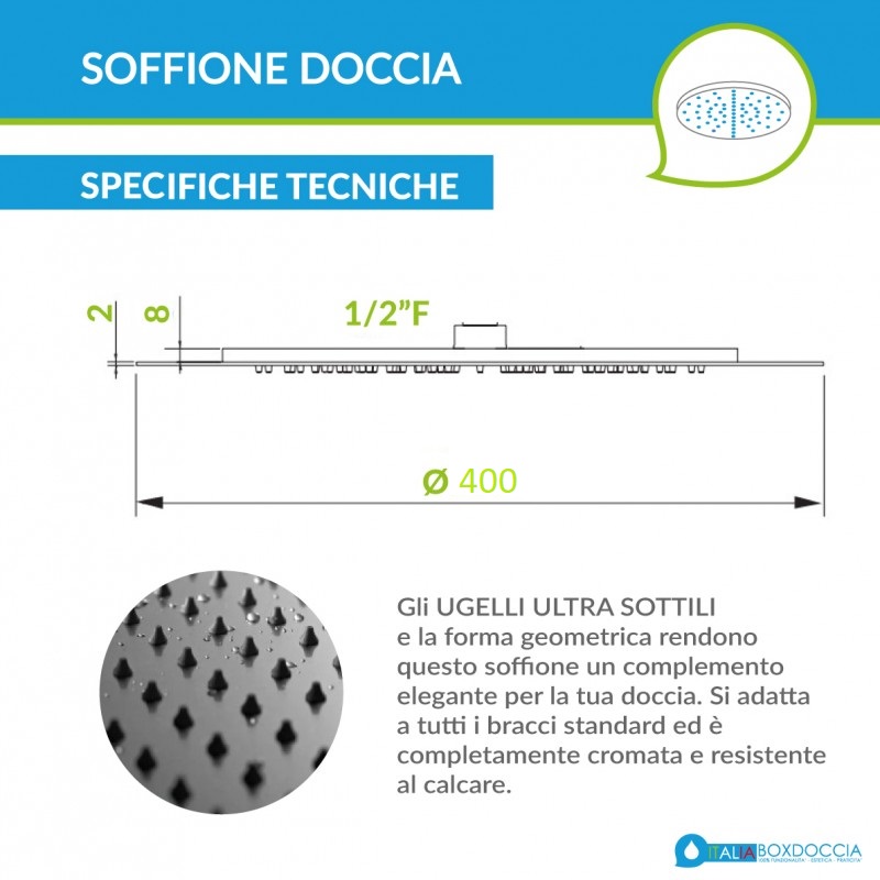 Soffione in acciaio inox cromato lucido tondo, con un diametro di 400 mm e fianco ultrasottile di soli 2 mm, da abbinare con il braccio doccia che piu vi aggrada, dotato di ugelli in silicone grigio anticalcare, snodo ed attacco da 1/2". Esteticamente meraviglioso, molto robusto e ad un prezzo unico.