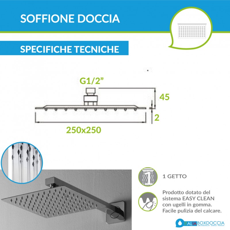 Il set doccia proposto, è composto da diversi elementi, ognuno di essi è realizzato con cura con materie prime di elevata qualità. Il soffione e il braccio doccia contenuto nel set sono in acciaio inox AISI 316 spazzolato, di forma quadra, dallo spessore di soli 2 millimetri.