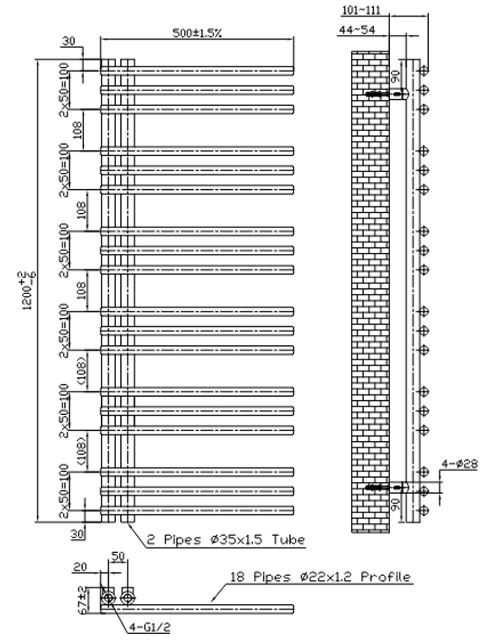 Il termoarredo Arpa include un kit di fissaggio e un valvolino di sfiato per una facile installazione. Con un interasse di 50 mm, è ideale per ottimizzare lo spazio e migliorare l'estetica del bagno.