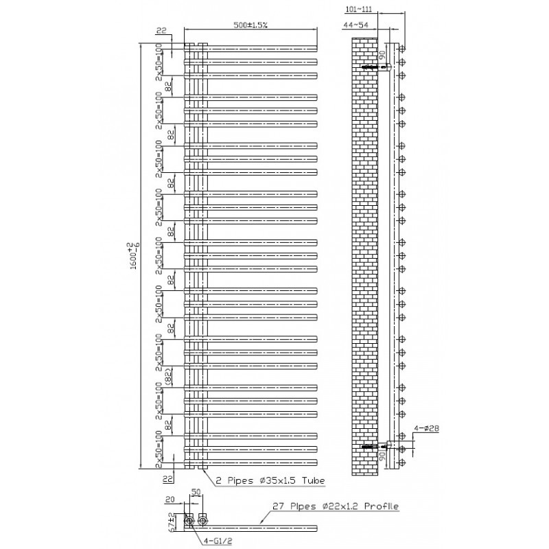 Il termoarredo Arpa include un kit di fissaggio e un valvolino di sfiato per una facile installazione. Con un interasse di 50 mm, è ideale per ottimizzare lo spazio e migliorare l'estetica del bagno.