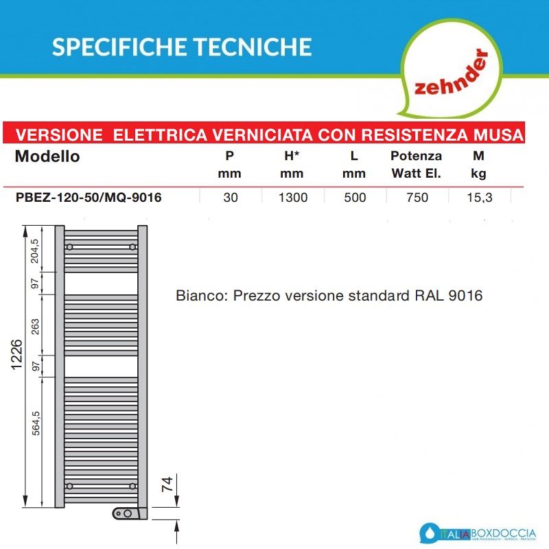 Scaldasalviette in acciaio con tubi Diam. 23 mm disposti orizzontalmente su collettori con profilo a D 30X40 mm. Dimensioni: P. 30 x H. 1300 mm. Altezza compresa di scatola di comando. Versione con Resistenza MUSA, posizionamento possibile solo a destra. Controllo della temperatura ambiente. Programmazione giornaliera / settimanale.
