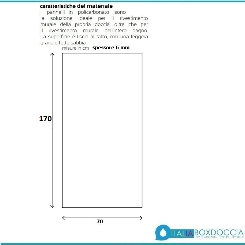 Pannelli costruiti in policarbonato. Sono la soluzione ideale per il rivestimento murale della propria doccia, oltre che per il rivestimento murale dell’intero bagno. La superficie è liscia al tatto, con una leggera grana effetto sabbia. Lo spessore di 6 mm. garantisce allo stesso tempo una grande resistenza, flessibilità e leggerezza. Per ridurre la comparsa di organismi comuni come funghi o muffe, la loro superficie non è porosa, rendendoli anti-batterici.