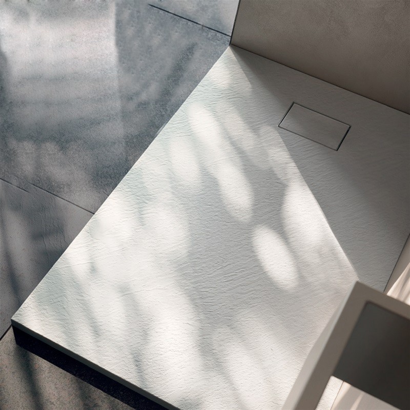 Piatto doccia ultrasottile realizzato in resina termoformata effetto pietra riducibile in fase di installazione.