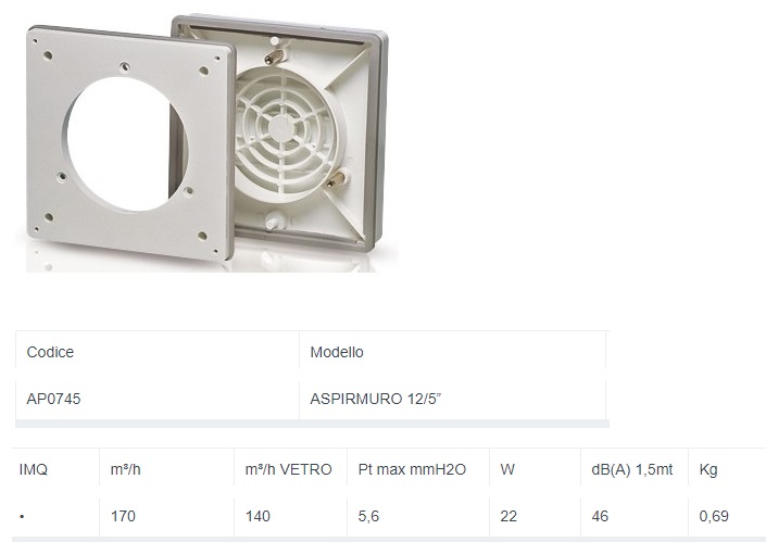 Vi proponiamo l'Aspiratore Elicoidale Aspiramuro Elettrico Serie Standard art. AP0745. Lo potrete utilizzare qualora non vogliate aprire le vostre finestre. E' altamente efficace per un ricambio dell'aria o per eliminare l'umidità o i cattivi odori dai vostri ambienti. Ideale sia per casa che per locali in cui sono adibite zone per fumatori o semplicemente per stanze in cui bisogna cambiare aria dopo un po di tempo.