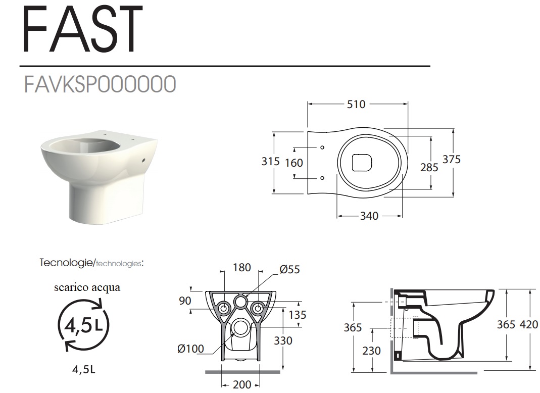 1 wc sospeso in ceramica serie Azzurra Fast con scarico a parete (scarica con 4,5 lt.) cod. FAVKSP000000