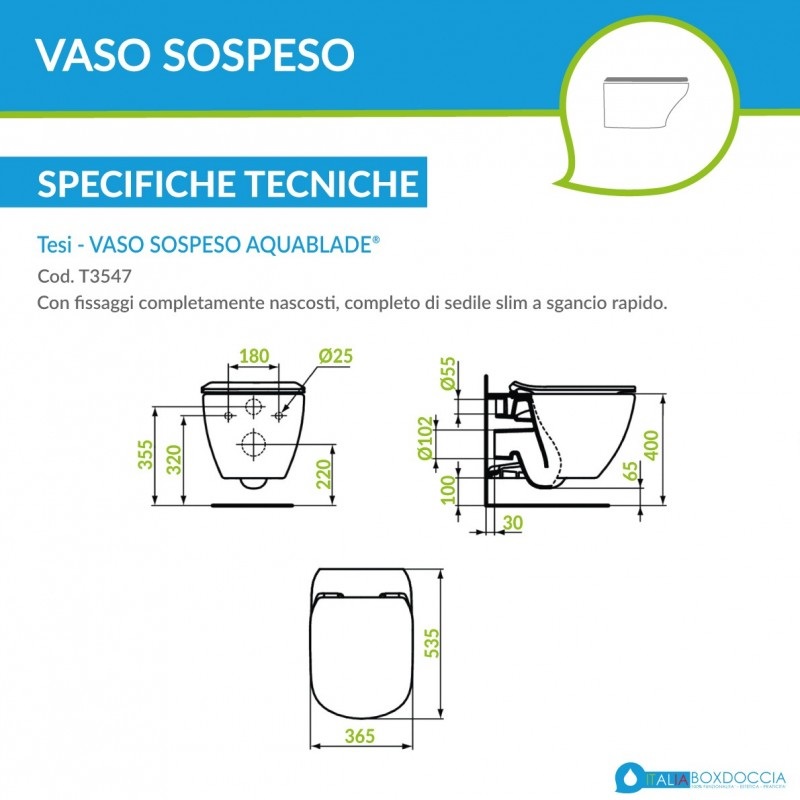 Nuova collezione di sanitari sospesi firmata Ideal Standard dalle forme morbide e moderne. Il modello tesi nasce con l'obiettivo di essere adattabile ad ogni tipo di ambiente bagno, a prescindere dallo stile. Infatti, la linea e arrotondata, morbida e allo stesso tempo semplice ed elegante. Il WC è abbinato al sedile in versione slim a chiusura ammortizzata, profilo minimal e sistema di cerniere a smontaggio rapido che consente di sganciare con estrema facilità lo stesso dal WC nelle operazioni di pulizia. Il sanitario ha il sistema di fissaggio completamente nascosto e viene fornito completo di kit TT02299548 che permette di ancorarlo sulle staffe metalliche installate a parete con estrema facilità. La dimensione del WC rientra nella media con una larghezza di 36 cm e una profondità di 53,5 cm. Trattandosi di un sanitario sospeso, la sua installazione rende l’ambiente pratico e funzionale rendendo la pulizia nella zona bagno un operazione molto semplice.