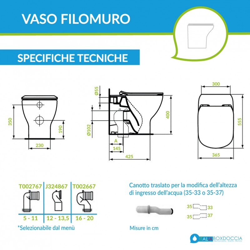 Il modello tesi grazie allo scarico traslato può essere installato anche su impianti esistenti senza dover apportare modifiche invasive all'impianto. Il sistema scarico traslato permette di installare i sanitari in impianti dove la distanza dal centro foro dello scarico al muro è compresa tra 50 a 200 mm, il tutto attraverso apposite curve tecniche. A completare il sistema scarico traslato è previsto un raccordo eccentrico che offre una flessibilità di 2 cm. ![]()